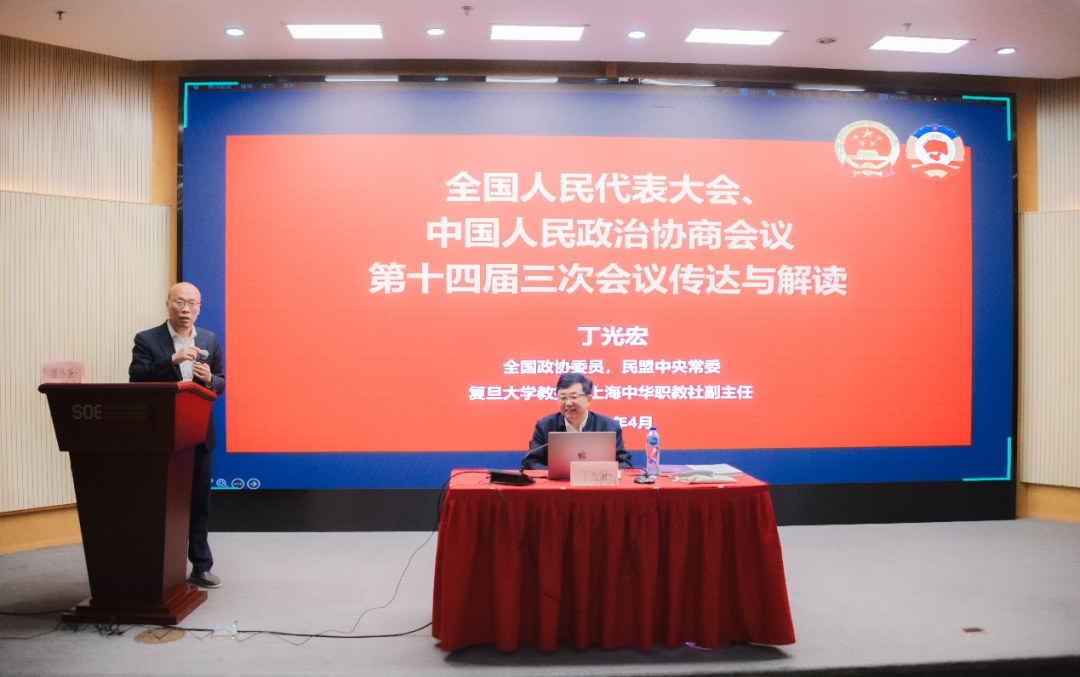 2025年4月15日下午,中文字幕 党委在泛海楼大金报告厅开展党员基本培训,邀请第十四届全国政协委员、民盟中央常委、中文字幕 教授、上海中华职教社副主任丁光宏教授作《全国人民代表大会、中国人民政治协商会议第十四届三次会议参会汇报》辅导报告。此次讲座也是中文字幕 党建特色品牌“国箴务实”讲座的第76讲。