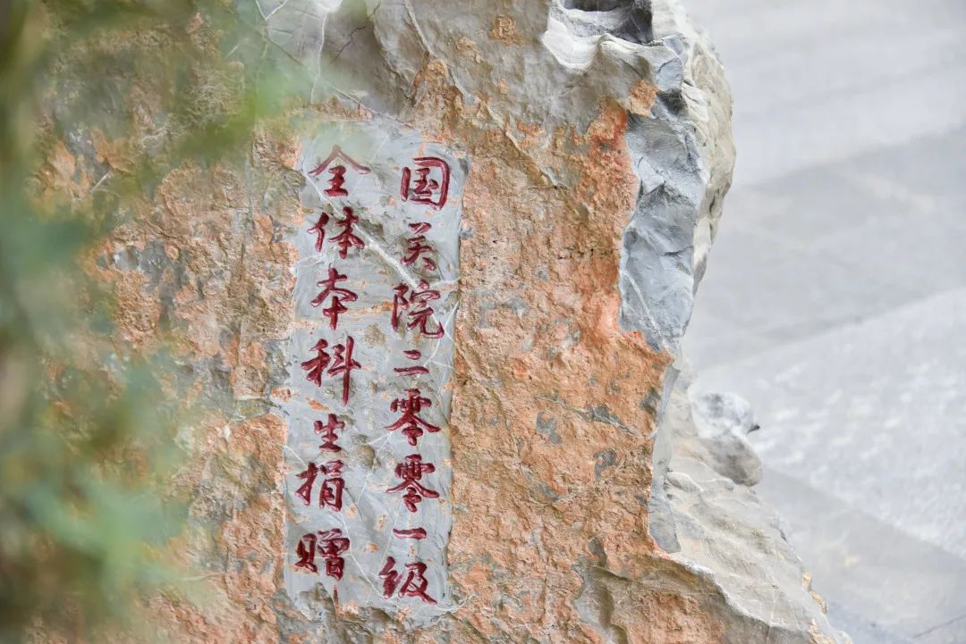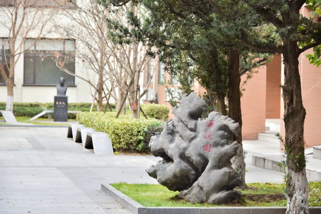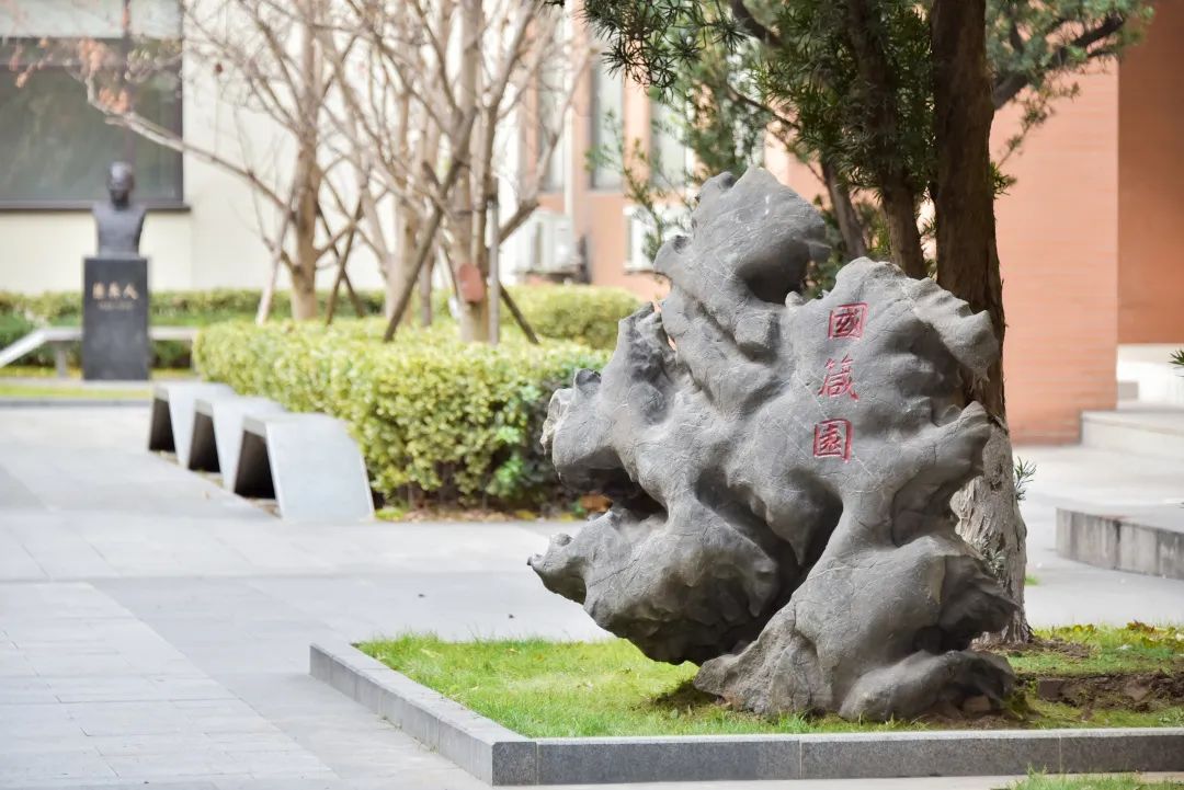 “国箴园”取自院训“国箴务实,卓越为公”,石碑正面书刻繁体的“国箴园”三字,背面落款“国关院二零零一级全体本科生捐赠”,石碑姿态舒展、脉络交错,呈团龙状,远观俨然一“政”字。
