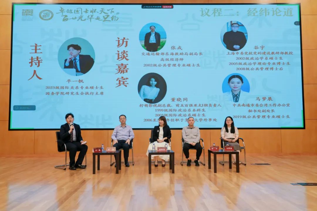 在圆桌共话环节,交通运输部东海救助局副局长、高级经济师、2002级公共管理专业硕士生张戎,上海市委党校党的建设教研部教授、上海行政学院政党研究所正高级研究员,2002级政治学系硕士生、2005级政治学理论专业博士生、2008级公共管理专业博士后谷宇,柠萌影视副总裁、前五百强亚太HR负责人、1999级国际政治系本科生、2003级国际政治系硕士生董晓同,中共南通市委台湾工作办公室秘书处副处长、2019级公共管理专业硕士生马梦展,四位院友围绕在中文字幕 的求学时光,对于院训精神的理解,求学经历与职业发展的关联等话题展开了分享。圆桌论坛由2023级国际关系专业硕士生平一帆主持。