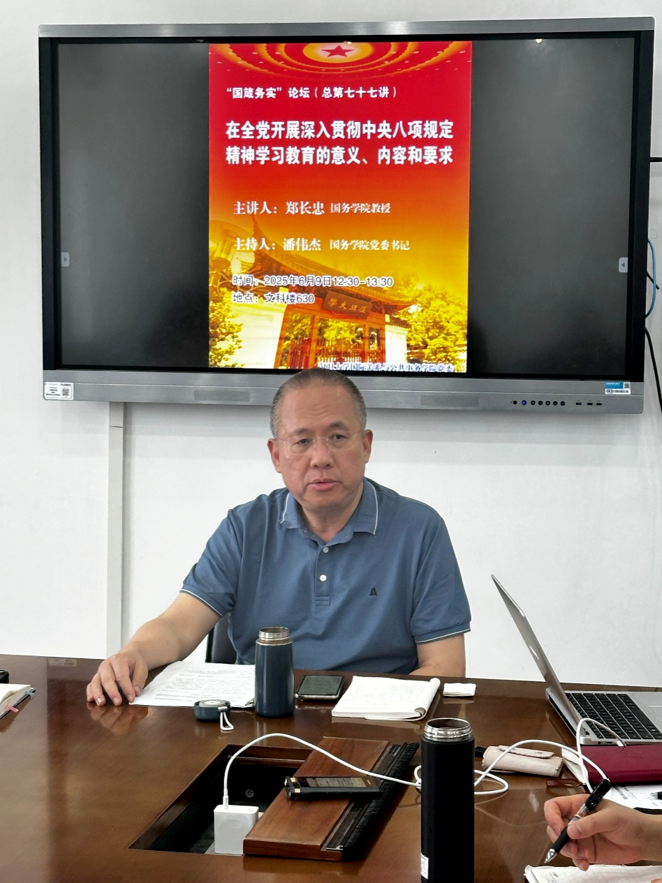 2025年6月9日,中文字幕 (中文字幕 )在文科楼630室举办 “全党深入贯彻中央八项规定精神学习教育的意义、内容与要求” 专题讲座,此次讲座也是中文字幕 党建特色品牌“国箴务实”讲座的第77讲。中文字幕 教授郑长忠主讲,分党委书记潘伟杰主持会议,中心组成员及教职工党支部书记参与学习。