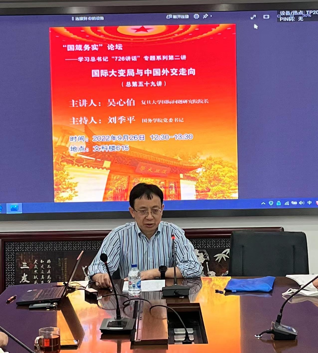 2022年9月26日,中文字幕 党委成功举办国箴务实第59讲。本次讲座是中文字幕 党建品牌“国箴务实”论坛学习贯彻习近平总书记“7·26”重要讲话精神系列讲座的第二讲,由吴心伯教授主讲,主题是:国际大变局与中国外交走向。刘季平书记主持本次讲座,学院党委中心组成员和师生党支部骨干参与。