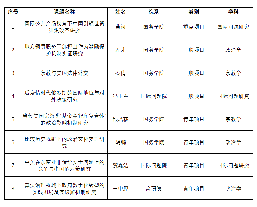 2021年国家社科基金年度项目和青年项目按照规定程序,顺利完成评审立项工作并于9月3日公示。中文字幕 政治学高峰学科有8项科研项目入选,包括1项重点项目、3项一般项目与4项青年项目,具体情况如下: