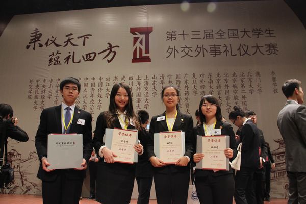 发布时间:2014-12-09 采访|陈陆琪 摄像|黄越供图|外交学院 编辑|卢艺唯 2014年11月21日至23日,第十三届全国大学生外交外事礼仪大赛在北京外交学院如期举办。由国际政治系12级的杨雨清(领队)、陈宇婷和社会科学试验班14级的祝姝婷、姬梦迪四位同学组成的复旦代表队赴北京参加了此次比赛,经过激烈的预赛选拔和决赛角逐,从全国29支代表队中脱颖而出,充分展现了复旦学子的外交风采,为我校赢得了二等奖的荣誉。