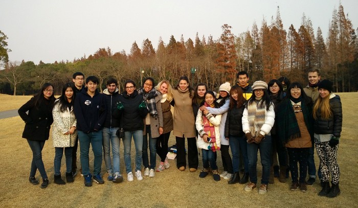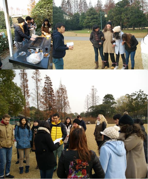 上午在学校正门集合后,21名同学们就踏上了前往滨江森林公园的旅途。在出发前,所有中外学生都根据抽签分为五组,作为之后游戏环节的分组依据。各组同学在前往森林公园的途中就选定了自己的组名,并在相互交流中开始互相了解。“星星组”、“fresh meat”等独具特色的组名引起了大家的欢笑,中国学生演唱的暖场歌曲更是带动了大家的小合唱,掀起了活动的第一次高潮。 在滨江森林公园,大家便进行了一系列分组游戏:四人五足、找共同、情景剧演绎等,中午还在烧烤中其乐融融地一同分享美味与欢乐。期间,大家载歌载舞,打成一片。意大利同学向大家表演了家乡歌曲,还现场教授意大利语大舌音发音,中国学生也演唱了一些中国歌曲,中外学生虽处冬日户外,但仍在滨江森林公园留下了欢声笑语。 活动虽然只有一天时间,但给中外学生留下了温馨的记忆。在回程中,所有人迫不及待地与一同做游戏的队友加了微信,并留下各种联系方式,依依惜别,期待下一次的聚会。