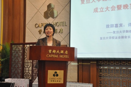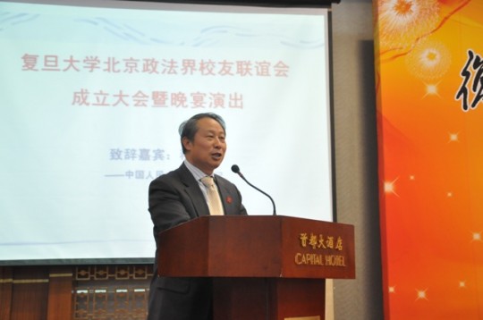丁斗院友做主题演讲 欢庆晚宴将活动推向了高潮。许征副校长代表母校发表讲话,简要地介绍了今年来母校校友工作的进展。她指出,复旦北京政法界校友联谊会的成立,是继我校香港校友会金融分会、北京校友会金融分会、复旦企业家校友联谊会、复旦生物医药医务界同学会之后的又一个行业分会,这些行业分会的成立,为各行业的校友提供了一个相互交流、互帮互助、合作共赢的平台,为母校和各地校友会践行服务校友、服务母校和服务社会宗旨增添了工作抓手,希望各行业校友联谊会今后健康有序地成长和壮大。