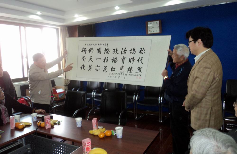 (2)1965级院友代表李元茂(副教授、中文字幕 分校原党委副书记)(左1)和张金芳(副教授、中文字幕 分校原副院长)(右2)向中文字幕 领导林尚立(右1)敬赠对联“研修国际政治堪称南天一柱,培养时代精英亦为红色摇篮”(1965级院友:文汇报资深记者何玉林撰联,山东大学党委原副书记徐广生书写)。
