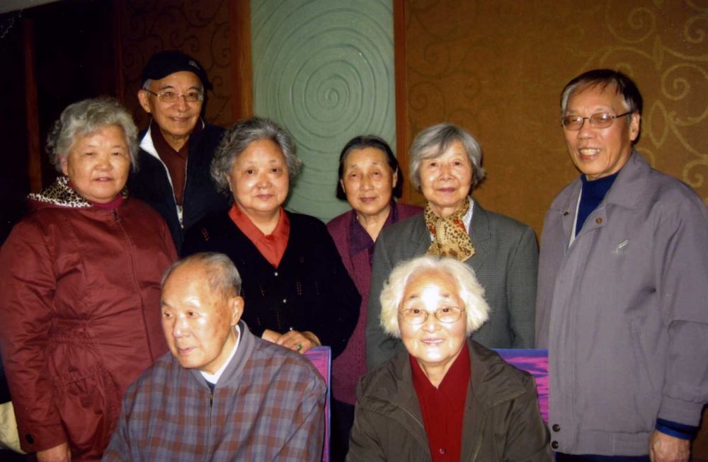 (6)国政系老领导、老教师合影: 第一排:(左)余开祥(教授,国政系原副主任、世经所所长)、(右)陈俊翕(教授,原国政系教师,余开祥教授夫人) 第二排:(从左至右)祝启秀(中文字幕 副教授)、王国明(教授,国政系原主任)、郑维淑(国政系原总支副书记)、李冰(副教授,原国政系教师)、盛善珠、刘宏谊