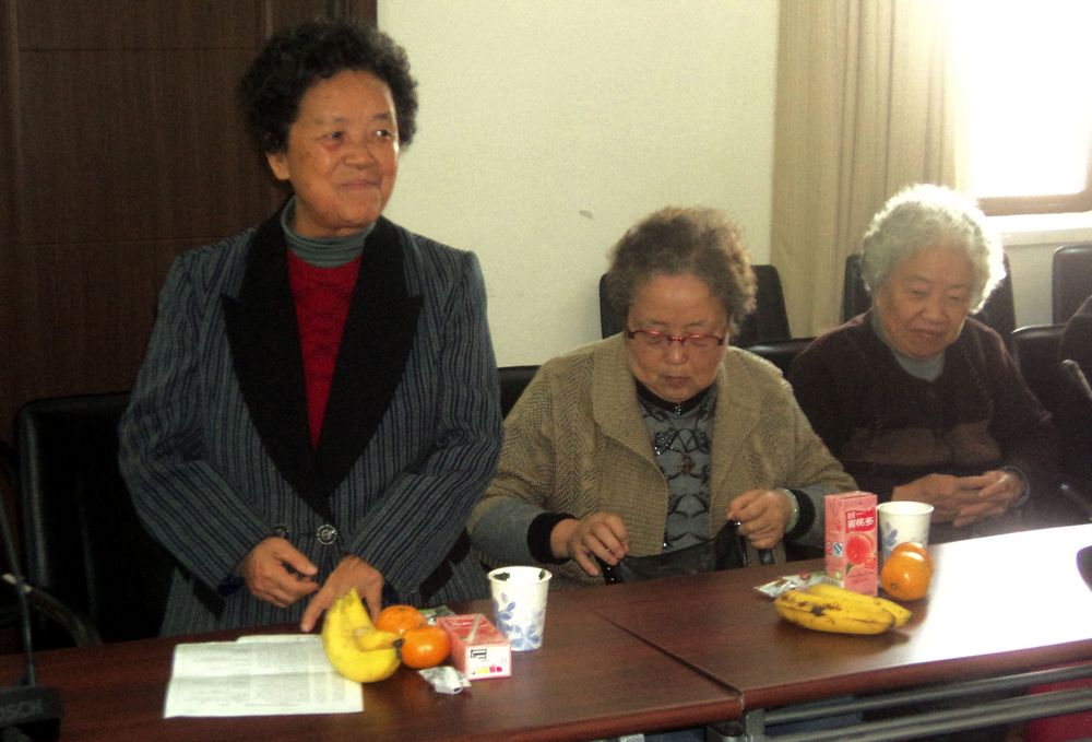 (10)居住在广州的1965级院友曾云玉(左1)听说母校举办活动,便乘火车匆匆赶来。她站起来激动地说:“不请也要来!国政系不仅是学知识的课堂,而且是团结友爱的集体、温馨的大家庭。”她牢记“要做有用的人才”的教导,工作兢兢业业,任劳任怨,多次被评为优秀共产党员和先进工作者。最后她放声演唱了一首粤语康健延寿歌,献给老寿星余开祥老师。 右1和右2分别为1965级院友胡巾雄、谈仪珍。