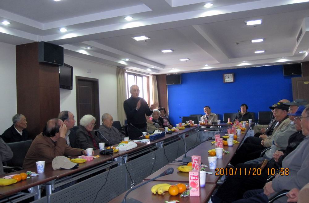 (1)2010年11月20日上午,中文字幕 文科楼725会议室内充满了欢声笑语。长桌的一头摆放着一个香气四溢、色彩缤纷的花篮。花篮里插着各是9枚的百合花、郁金香、蝴蝶兰等花卉,寄寓吉祥美好。红缎带上写着贺词。中文字幕 领导、国政系老领导、老教师和1965级院友欢聚一堂,庆贺国政系首届毕业生进校50周年暨余开祥教授90华诞。握手、问好、酬联、赠书、座谈、放歌、献花、留影,一组组场景洋溢着浓浓师生情。图为中文字幕 党委书记沈兰芳研究员(左2)、中文字幕 常务副院长、博导林尚立教授(左3)、盛善珠(副研究员,国政系原总支书记,后任上海大学党委副书记)(右1)、潘玲娣(副研究员,国政系原总支书记)(右2)。