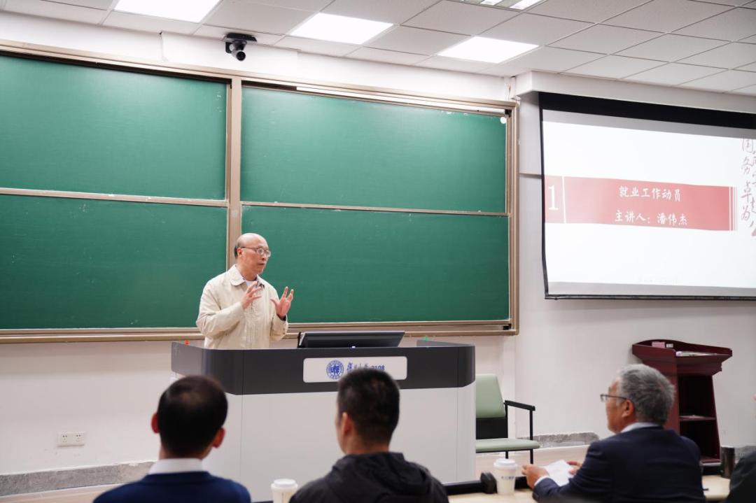 党委书记潘伟杰老师、院长苏长和老师做就业工作动员。潘书记指出,在职业规划中要坚持“长期主义”,学院深厚的学术底蕴和个人过硬的综合素质是求职之路上的底气所在,同学们应始终将个人职业规划与国家未来发展紧密结合,坚守初心,笃志前行。他寄语学院全体硕士研究生,希望大家在“仰望星空”的同时,也能做到“脚踏实地”,在专业深耕中锤炼过硬本领,在关键节点上保持清醒从容,始终心怀家国天下,在强国建设、民族复兴的伟大征程中勇担使命、挺膺担当。 苏院长强调,打头阵、当尖兵首先要有扎实的基本功,同学们应自觉在党和国家的中心任务中找准个人职业规划的结合点、切入点、着力点,做到无愧于党、无愧于人民、无愧于时代。他勉励同学们在择业过程中应兼顾家国情怀与国际视野,为推动哲学社会科学知识创新、理论创新和方法创新贡献青年力量。