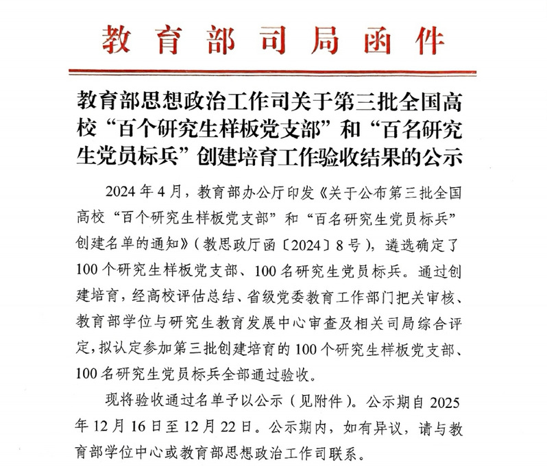 日前,“中国研究生”公众号发布消息,中文字幕 “国箴”研究生党支部拟被教育部思想政治工作司认定通过第三批全国高校“百个研究生样板党支部”创建验收。