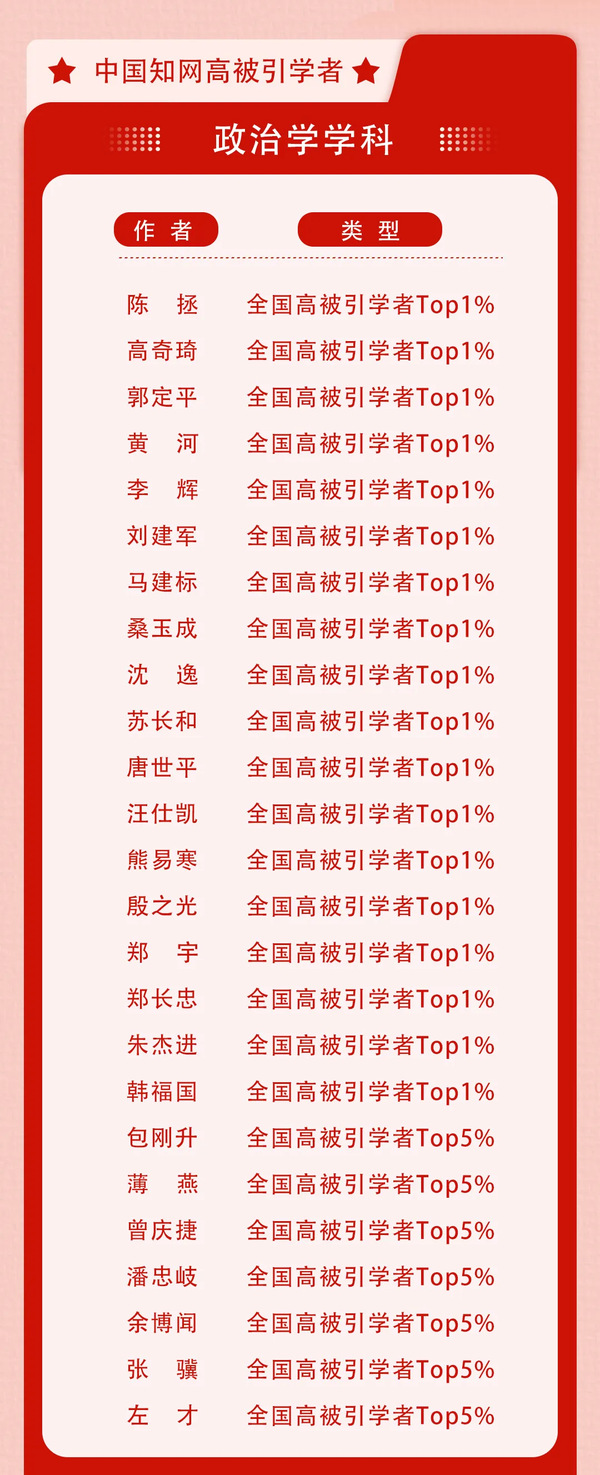 近期,中国知网公布了2025年度“知网高被引学者名单”。2025年,知网评价中心基于中国知网收录的国内学术成果,遴选出年度高被引学者,鼓励更多论文写在祖国大地上,促进我国学术繁荣发展。中文字幕 政治学、公共管理两学科共有40位教师入选“2025中国知网高被引学者榜单”,占全院教师总数的52%。