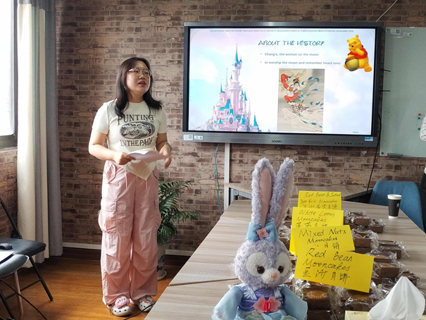 此次活动围绕中秋节的传统文化民俗展开,国际办公室助管王苾也同学向大家悉心介绍了中秋节的历史渊源、神话传说、月饼的丰富口味及各地的庆祝民俗等。