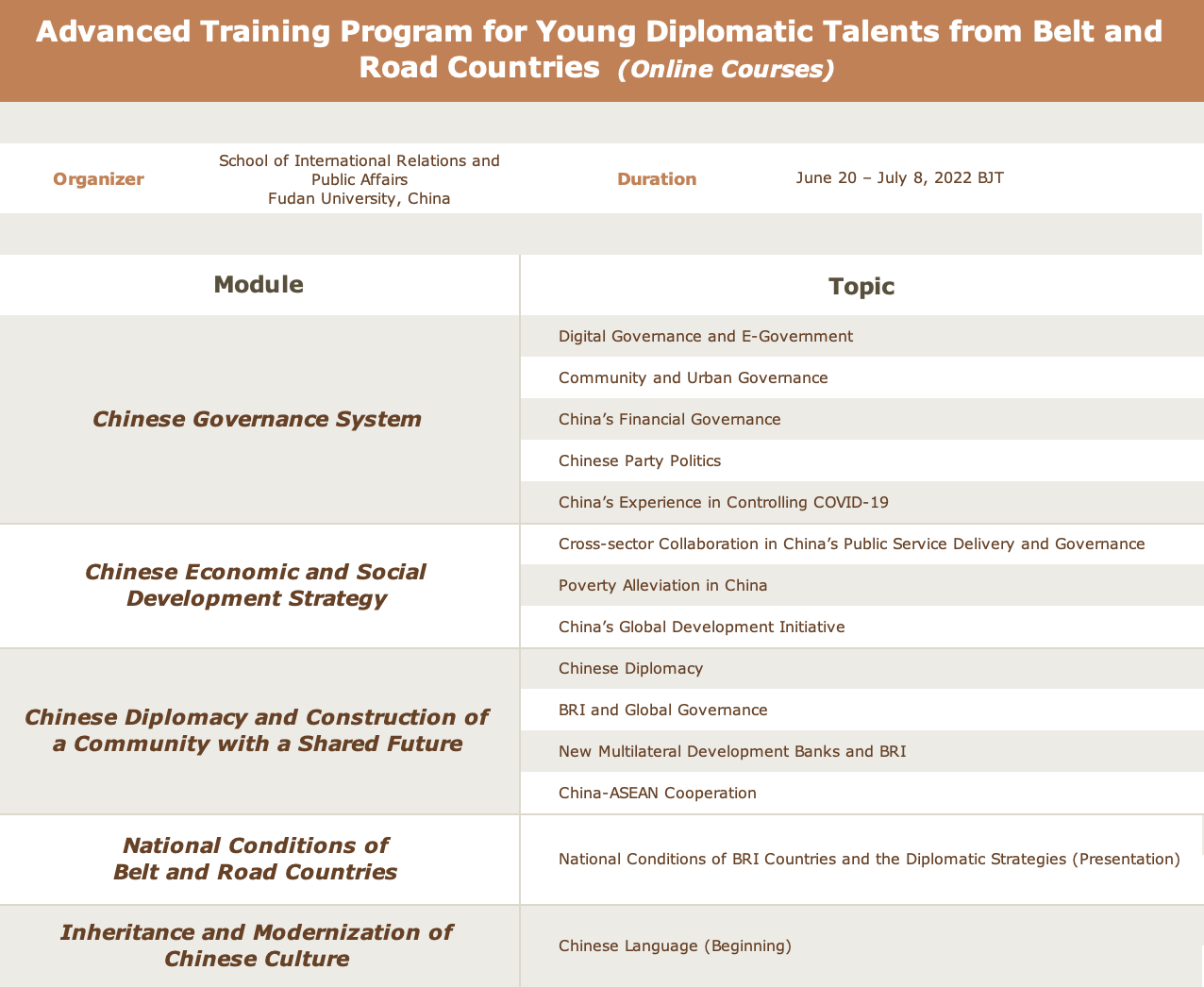 Advanced Training Program for Young Diplomatic Talents from Belt and Road Countries (the “Program”) is sponsored by Shanghai Municipal Education Commission and organized by School of International Relations and Public Affairs (“SIRPA”), Fudan University.