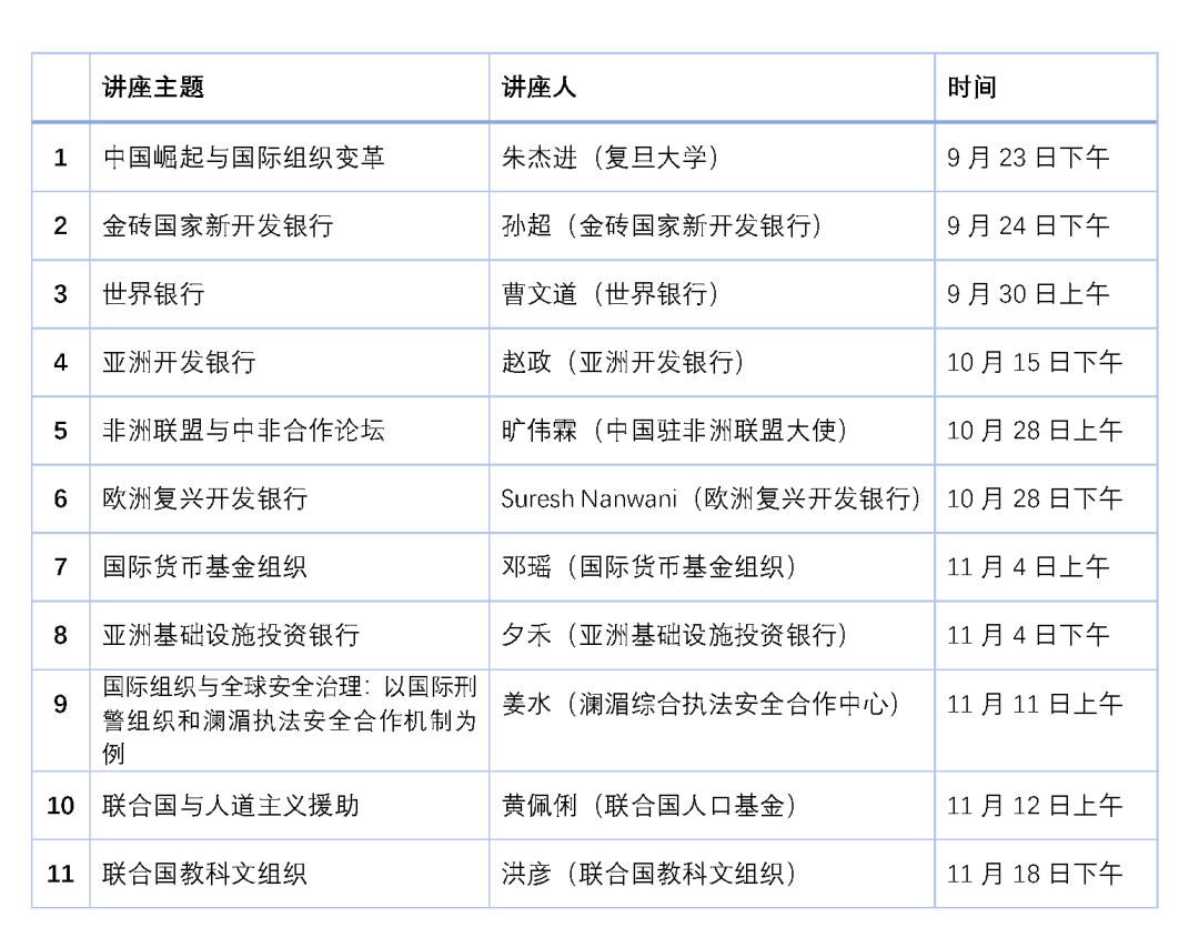 《国际组织前沿讲座》将介绍国际组织的前沿理论和实践知识,并广泛邀请国际组织的一线官员来分享国际组织的实际运作以及如何进入国际组织实习和工作的经验体会。课程目标是激发和培养学生对国际组织的兴趣,探究国际组织的理论和历史,理解国际组织现象背后的逻辑,形成国际组织研究的学术共同体。