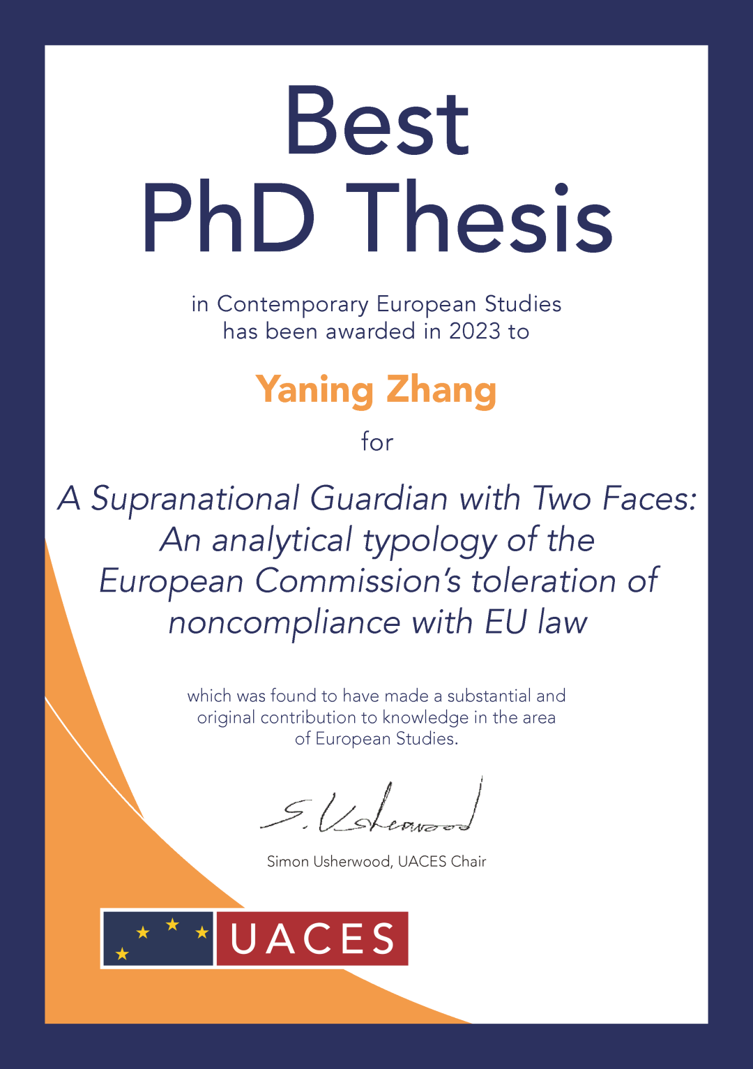 此次张亚宁博士的获奖论文为《超国家监护者的两面性:对欧盟委员会策略性容忍违规行为的类型学分析》(A Supranational Guardian with Two Faces: An analytical typology of the European Commission’s toleration of non-compliance with EU law)。